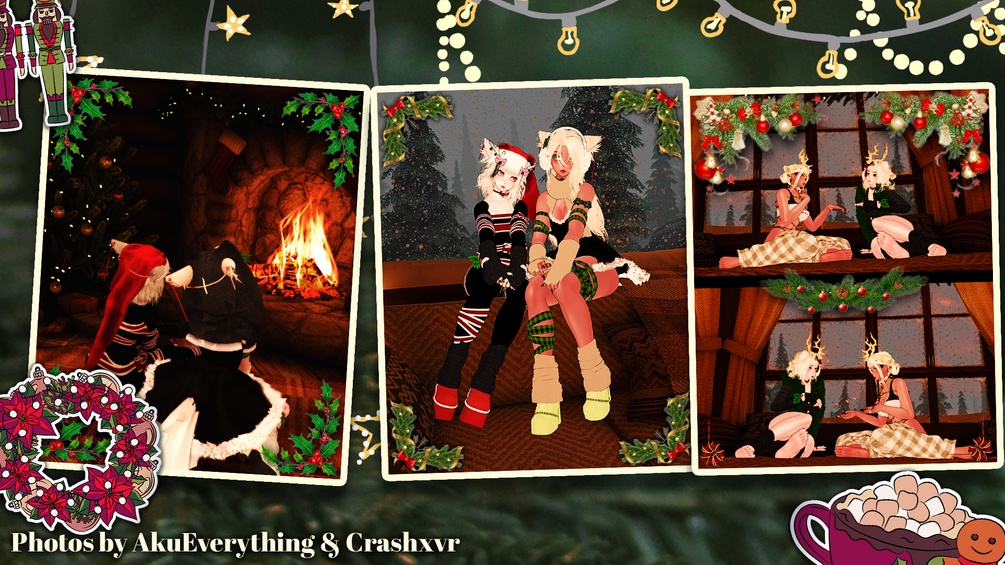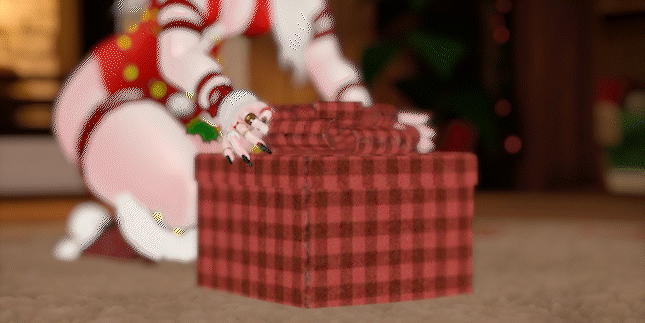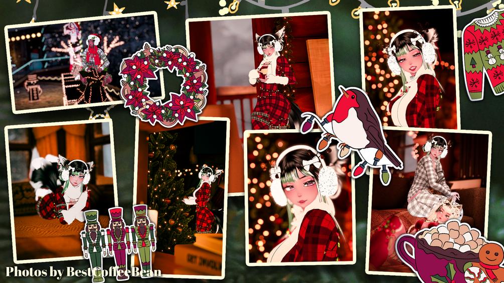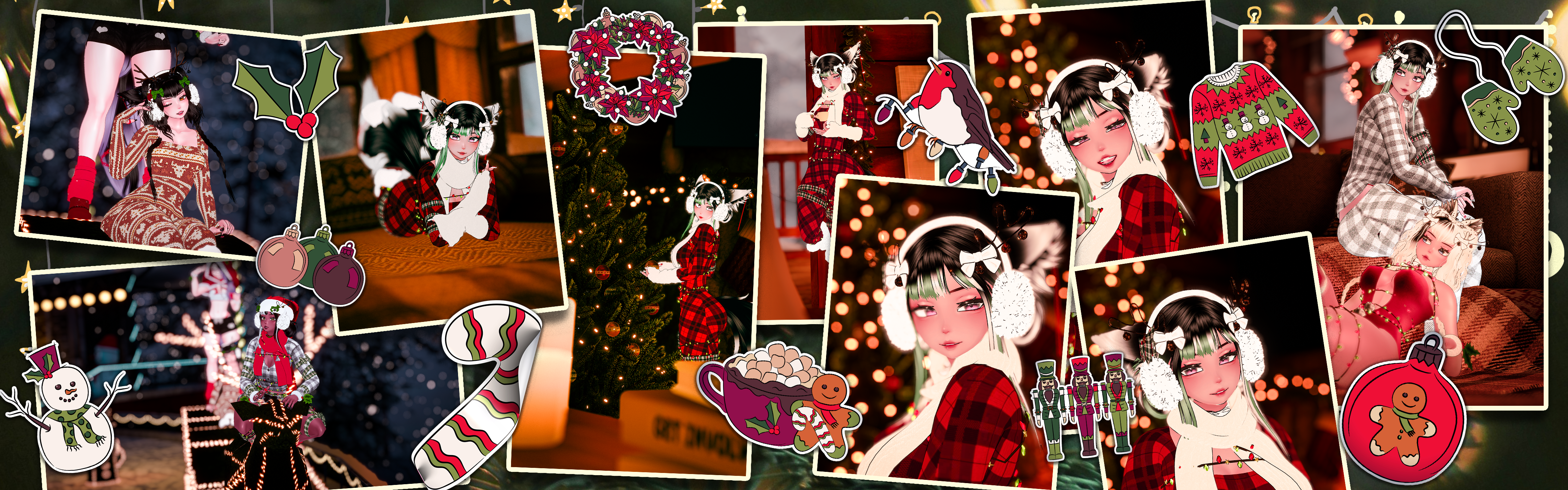 Head, Body, Buns & Skittlz Hair, Blitz Hair, Headcap & Lace Set,Hair Textures, Deer Tail, Snowflake Paisties, Ribbon Set, Cat Ears, Winter Boots, Christmas Dress, Christmas Earrings, Ribbon Antlers & Collar, Festive Puppy Ears, Short Winter Boots, Christmas Kitty Set, Deer Antlers & Ears, Shoulder Holly, Christmas Rings, Head and Body Textures, Christmas Nails, Winter Outfit, Wolf Ears & Tail, Sleepwear Set, Santa Hat, Sweatpants Bottoms (RETEXTURED DO NOT REUSE), Body Lights, Pole is by me! (DO NOT REUSE!), Facetracking Template.